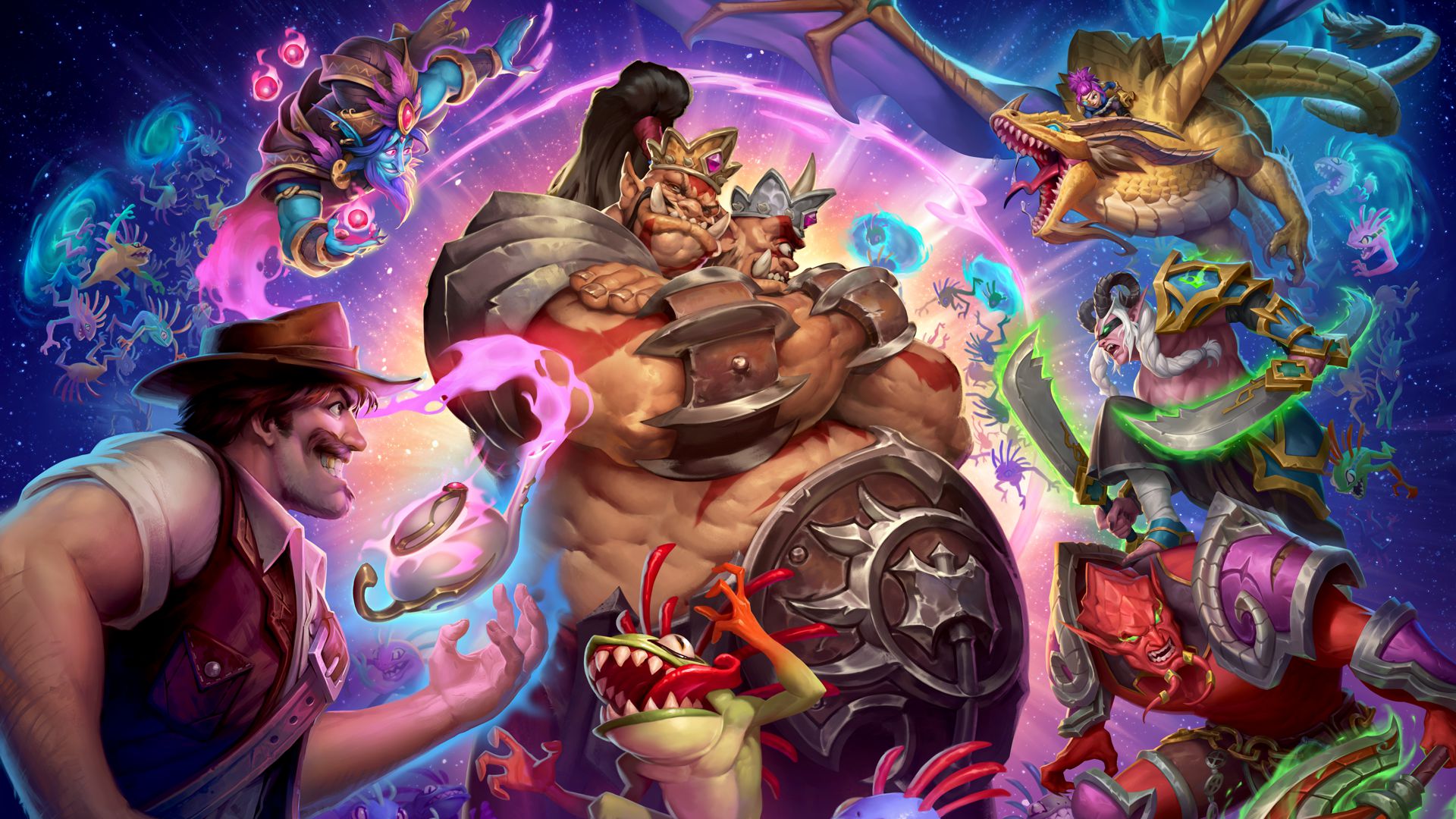 Nuevos héroes y esbirros: Con el lanzamiento de Dúos llegan nuevos héroes específicos para Dúos y cartas que aprovechan la jugabilidad nueva del modo: 4 héroes, 16 esbirros y 3 hechizos de taberna. Solo estarán disponibles en Dúos de Campos de batalla, no en el modo regular de Campos de Batalla.