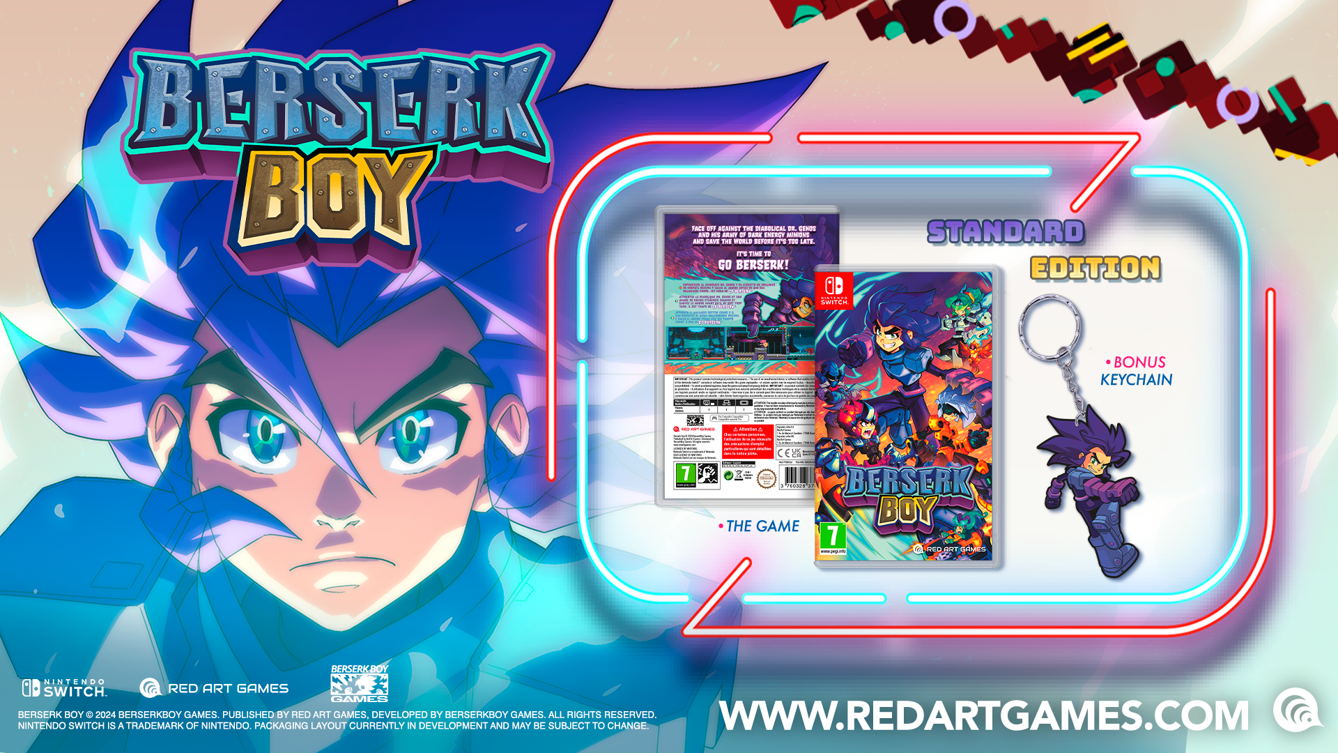 La edición física de Berserk Boy para Nintendo Switch incluye un llavero del protagonista.