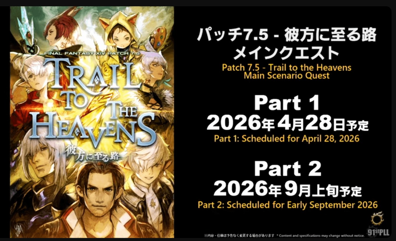Durante la 91ª transmisión de “Letter from the Producer LIVE”, SQUARE ENIX reveló el Parche 7.5, titulado Trail to the Heavens, como la más reciente gran actualización para FINAL FANTASY XIV Online, junto a una fecha de lanzamiento el 28 de abril.